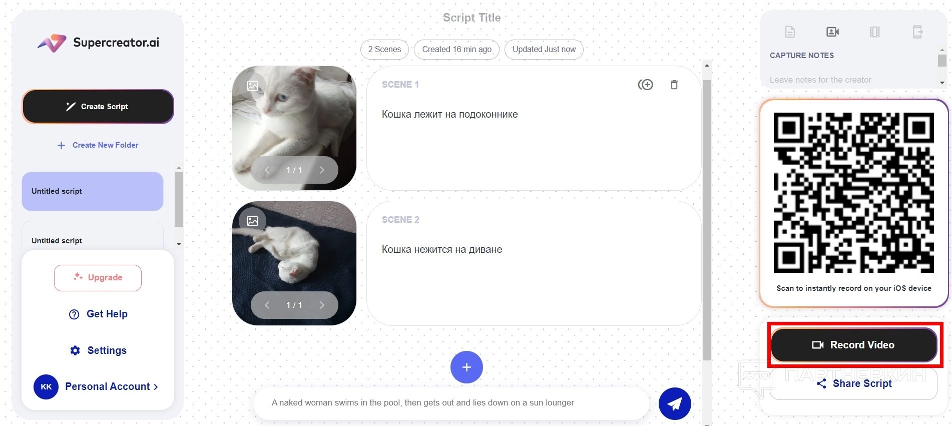 Для простого ролика достаточно использовать основной инструмент — простой сценарий. Напишите на русском или английском языке описание будущего видео и нажмите на иконку самолета. Система автоматически создаст сценарий без дополнительных настроек.
