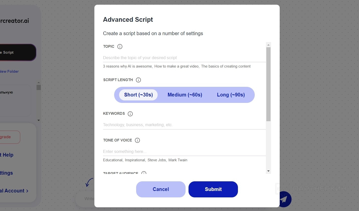- Script length. Длина ролика. Есть 30, 60 и 90 секунд.