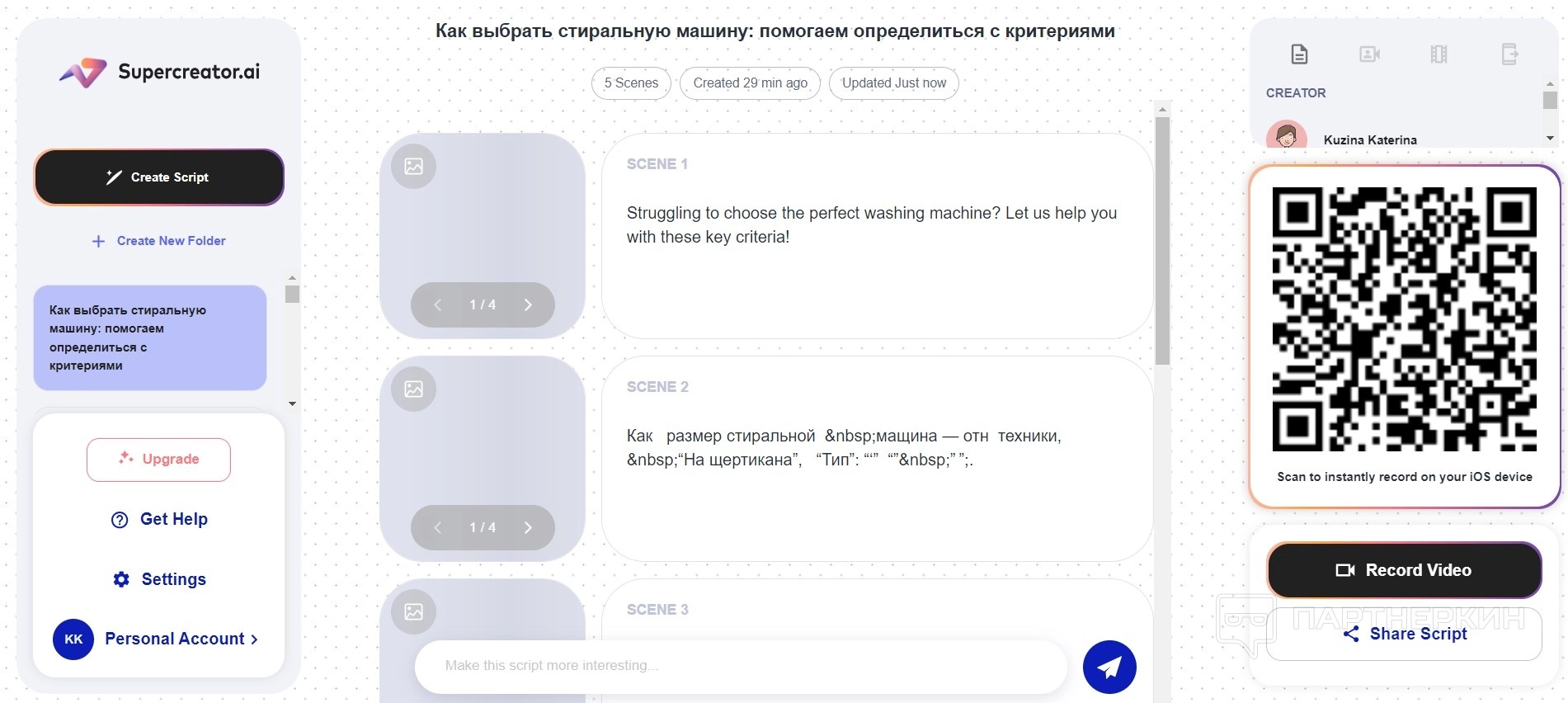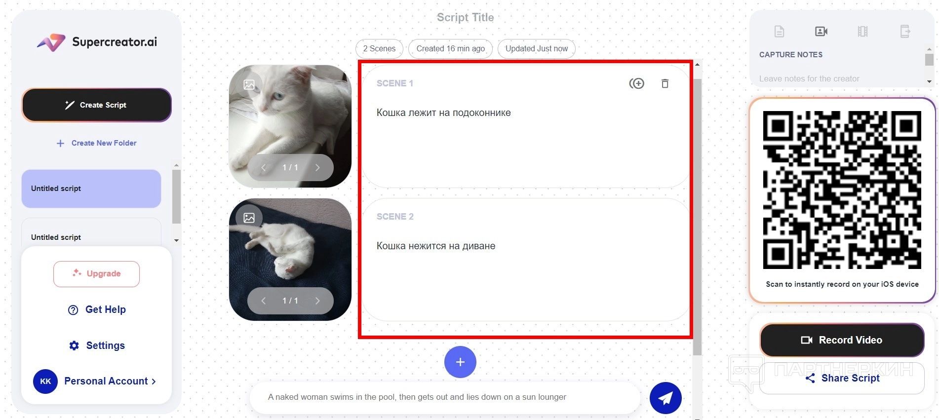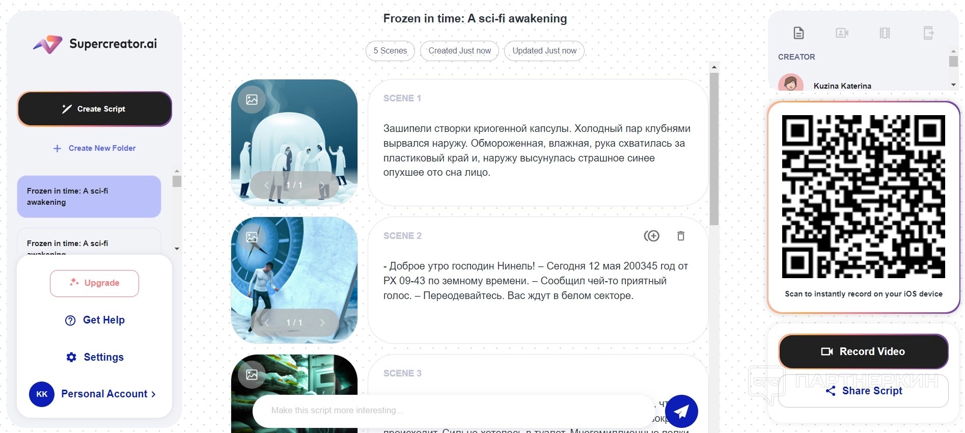 Система сгенерирует сценарий и разобьет текст по кадрам. Редактор ничем практически не отличается от написания сценария с нуля. Можно менять контент или сразу отправлять сценарий на запись видеоролика.