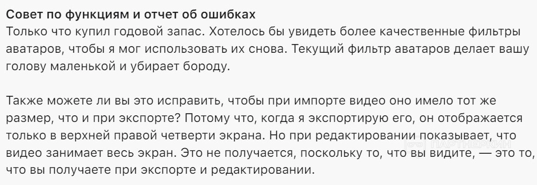 Один из пользователей отмечает некоторые недостатки, особенно когда речь идет о приобретении годовой подписки. Этот пользователь высказывает просьбу к компании исправить некоторые баги в фильтрах.