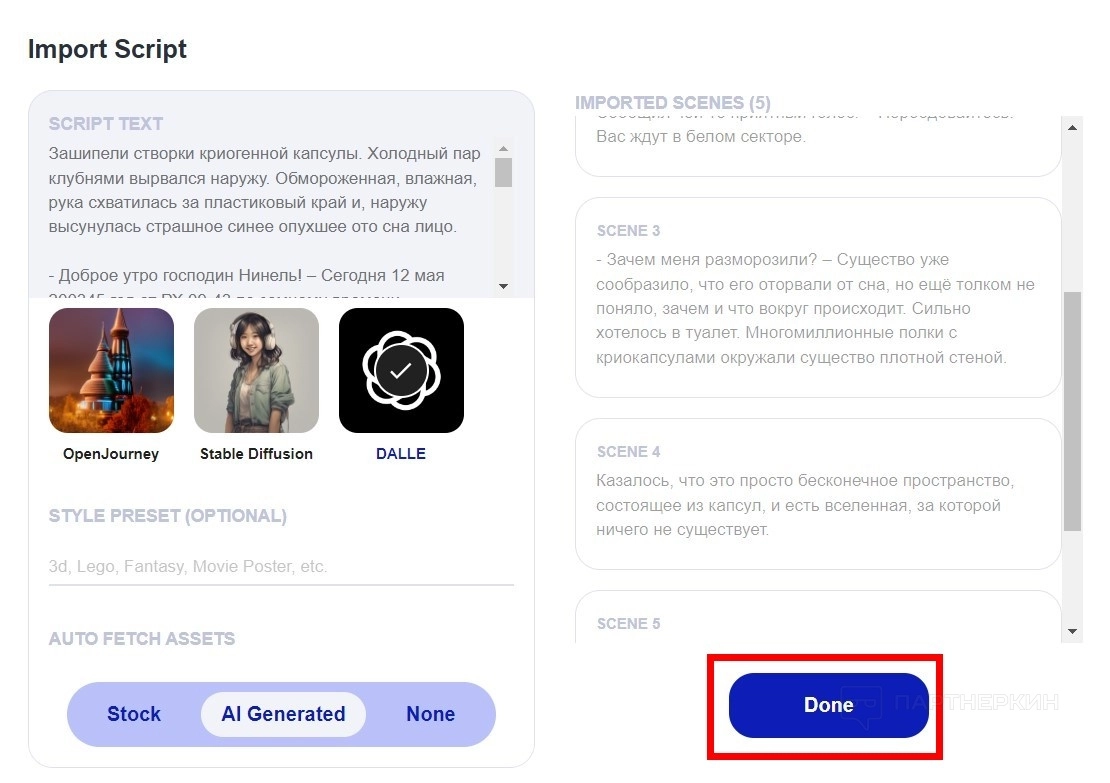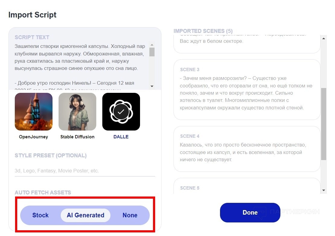 - Выберите тип генерации картинок (или видео): Stock (галерея сервиса), AI Generated (формирование картинок с помощью популярных нейросетей), None (без контента).