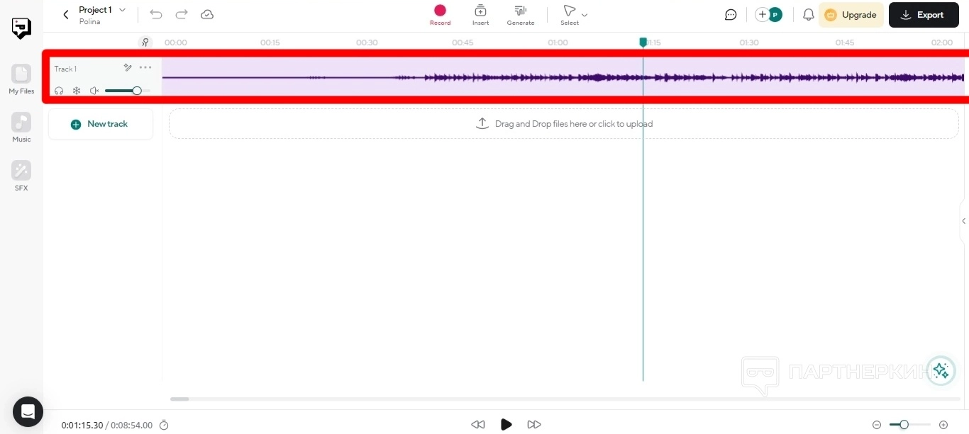 Бесплатный тариф не имеет ограничения по длительности аудиоряда, поэтому файл может быть как 10 минут, так и 10 часов. Как только он загрузится, аудиодорожка отобразится в редакторе.