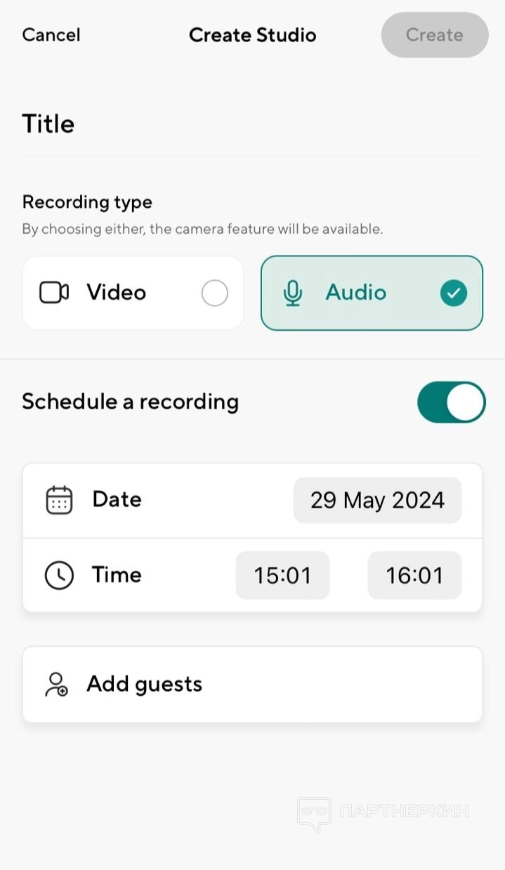 В открывшемся окне студии, аналогично веб-версии, выбираем тип записи и даем название. Отличительной чертой является совмещенные с данным этапом настроек календарь для планирования и приглашение гостей. Если в