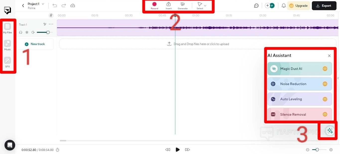Теперь ее можно изменять в соответствии с личными целями. Пользователь может добавить дополнительные эффекты и аудио, а также музыку из библиотеки (1), записать или добавить цифровой голос, обрезать длину трека или полностью поставить на мьют (2). Если есть платная подписка, то можно воспользоваться инструментами ИИ — удалить шум и паузы, оптимизировать диапазон и так далее.