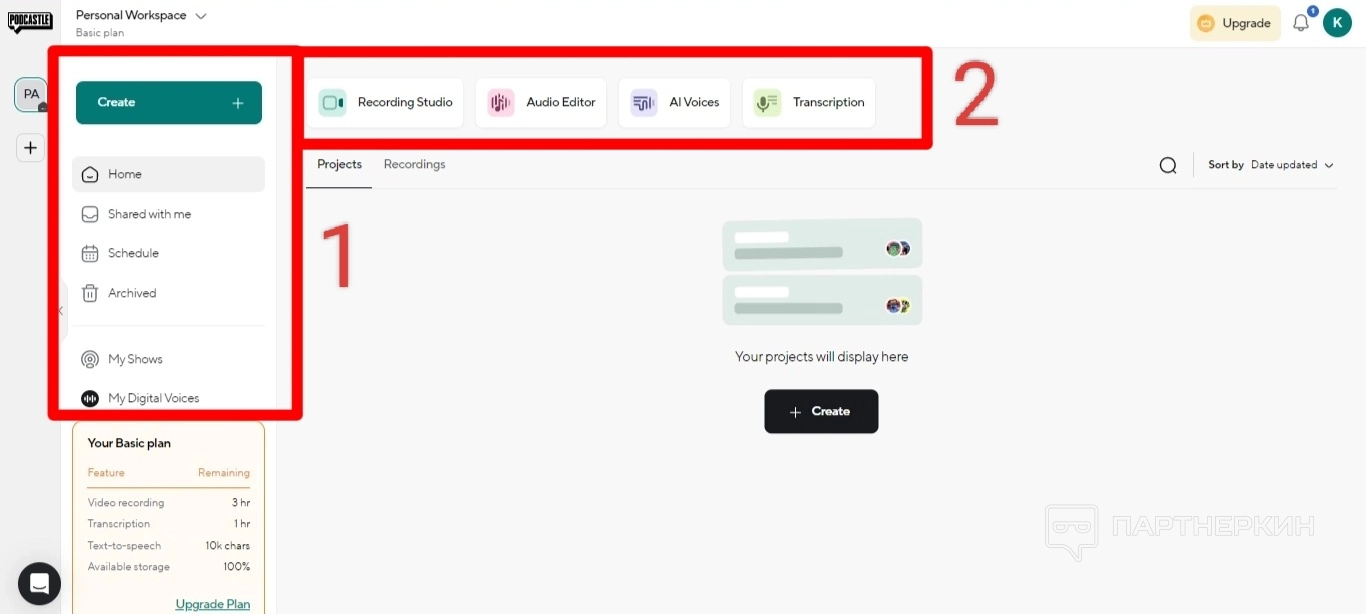 - my shows — раздел для создания полноценного шоу, в которое в дальнейшем можно добавлять новые выпуски, планировать эпизоды и многое другое. Проект такого типа можно соединить с учетными записями в Apple Podcasts, Google Podcasts и Spotify для прямого постинга или разместить специально сгенерированную ссылку на выбранных интернет-площадках;