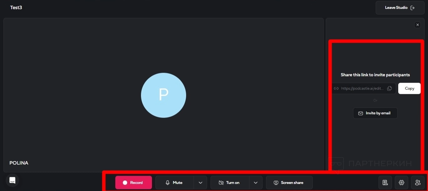 В открывшемся окне студии пользователь может контролировать начало и окончание подкаста, добавить запись видеоряда, демонстрацию экрана, а также заранее прописать скрипт для создания телесуфлера и пригласить дополнительных участников по электронной почте.