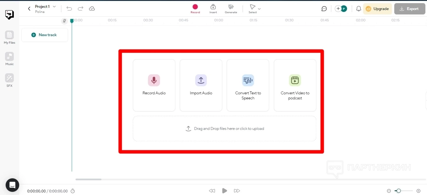 Далее нужно загрузить или записать аудио файл. Помимо этого в редакторе доступны транскрипция текста в речь и конвертация видео в аудиоряд.