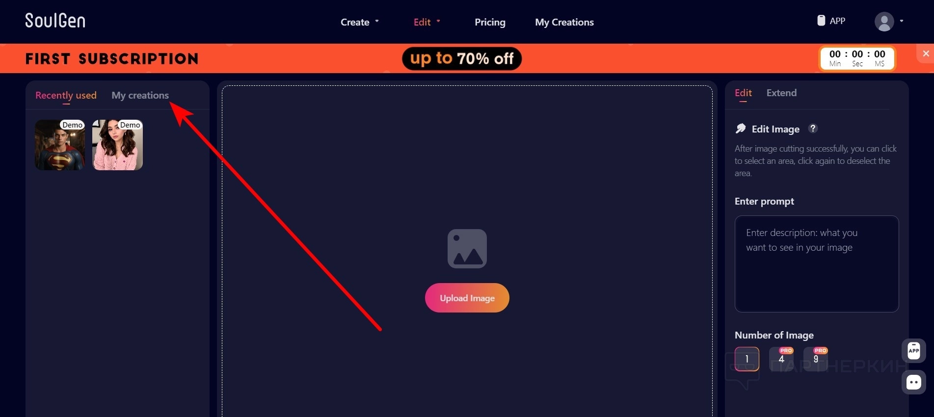 - Во вкладке My creations есть все картинки, которые были сгенерированы вами на данном сайте. Можно выбрать их.