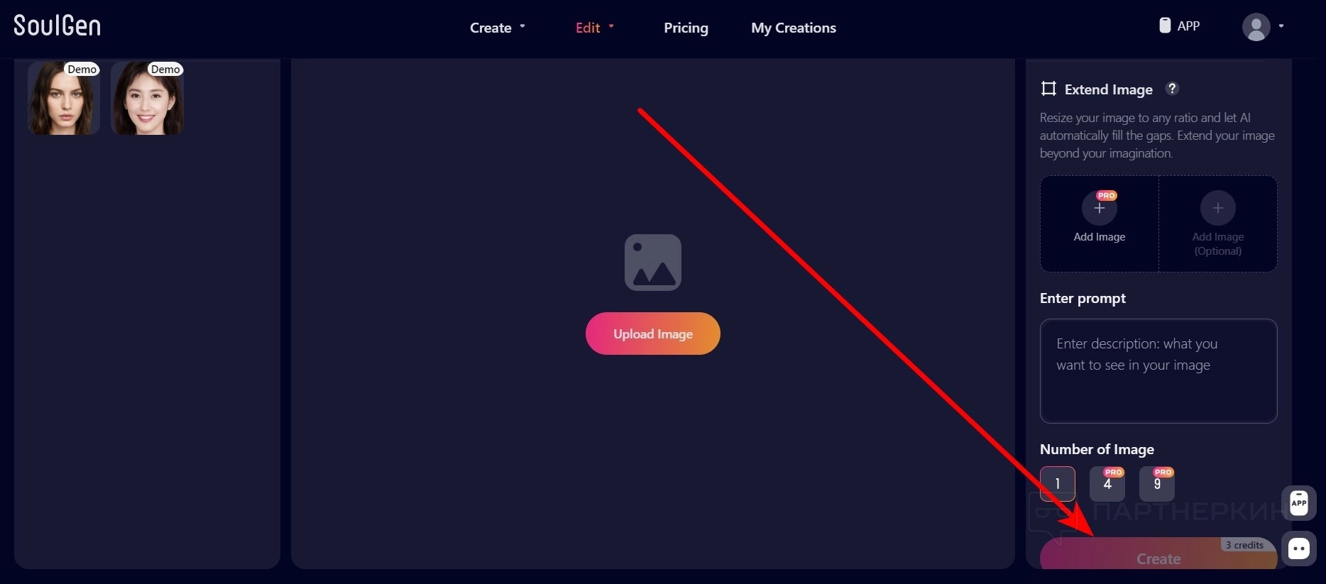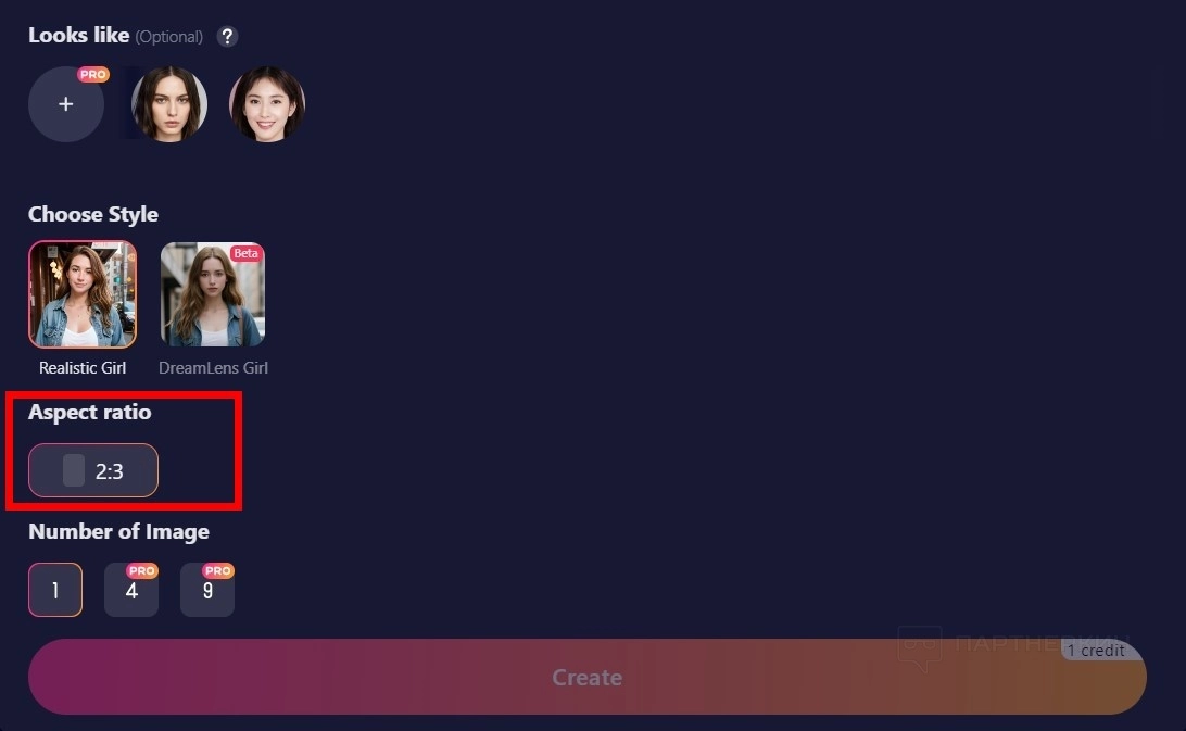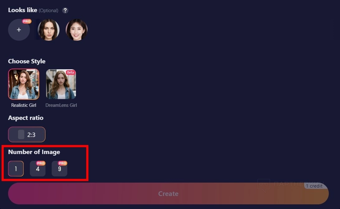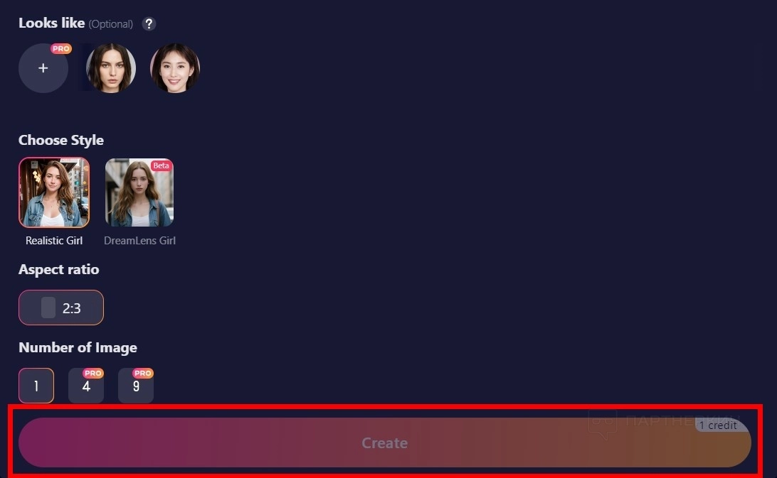 - Нажмите на кнопку Create . Одна генерация стоит 1 кредит.
