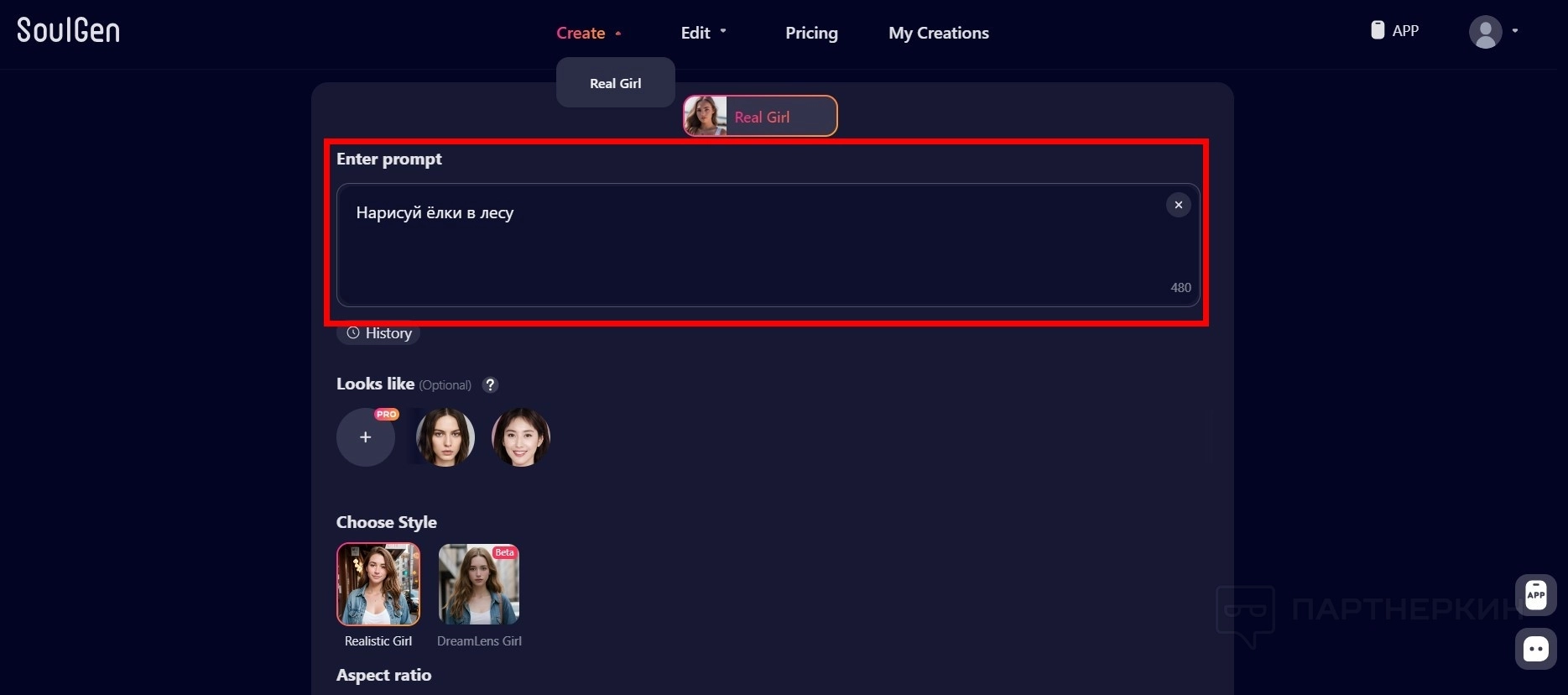 - На главной странице сайта выберите Create / Real Girl .
