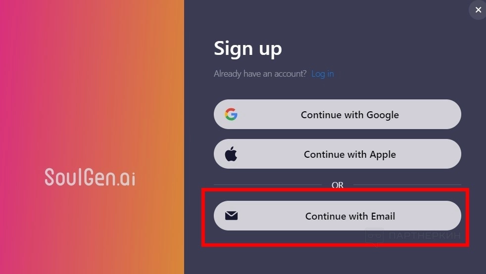 - Выберите пункт Continue with Email .