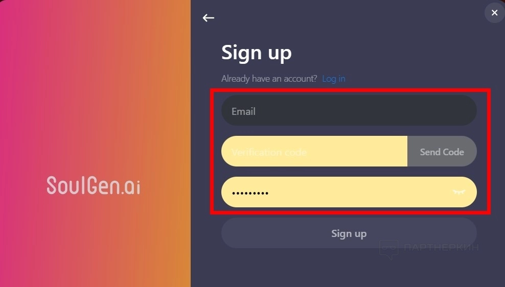 - Введите адрес вашего электронного ящика и придумайте пароль. Также нажмите на кнопку Send Code , чтобы верифицировать ваш email.