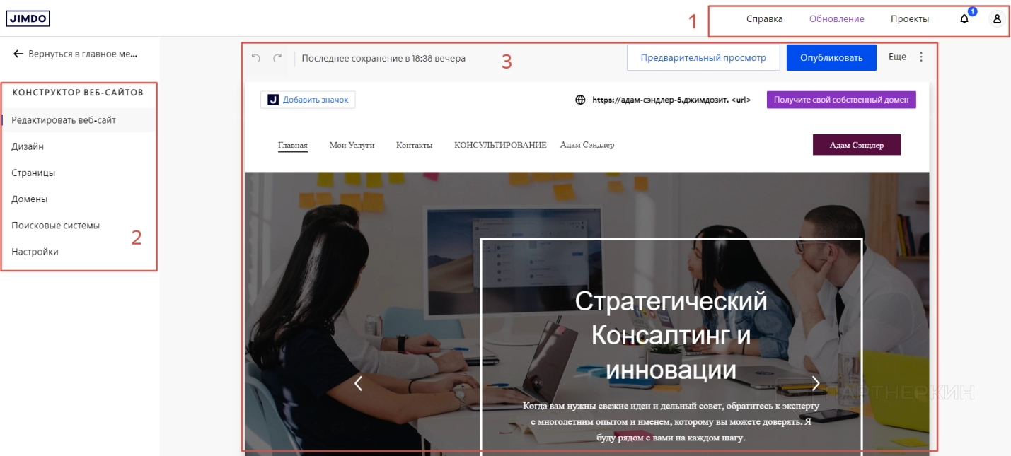 - Простота использования. Jimdo предлагает интуитивно понятный интерфейс с возможностью перетаскивания элементов (drag-and-drop), что делает процесс создания сайта доступным для новичков.