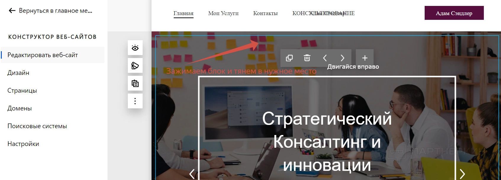 - Редактировать веб-сайт – здесь и осуществляется работа с блоками будущего сайта. Взаимодействие происходит за счет стандартного перемещения блоков мышкой.