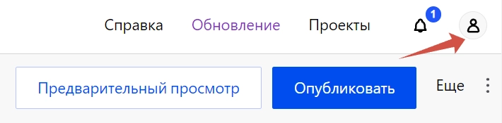 Раздел «Справка» в панели уведомления предоставляет доступ к справочному центру и документации. Рядом идет блок «Обновление», где можно выбрать тарифный план. Раздел «Проекты» отображает все созданные в рамках учетной записи проекты. Рядом находится значок, предоставляющий доступ в настройки, где можно изменить имя, электронную почту и прочие параметры.