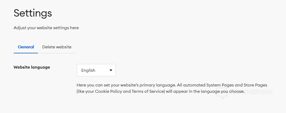 - Настройки – здесь можно выбрать язык интерфейса сайта или удалить созданный веб-ресурс.
