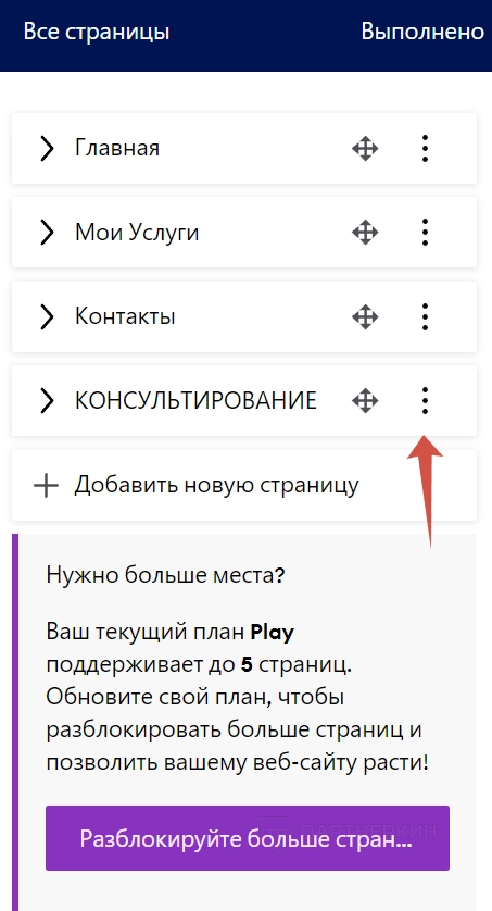 - Страницы – здесь вебмастер можно добавлять новые или редактировать уже существующие страницы сайта. Взаимодействие со страницами осуществляется за счет кнопки с 3 точками напротив названия.