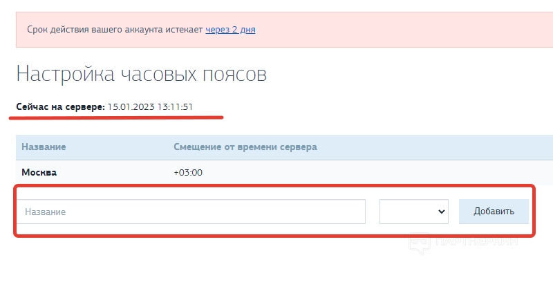 После этого откроется страница, где будет указано текущие на сервере время и инструмент для выбора подходящего часового пояса.