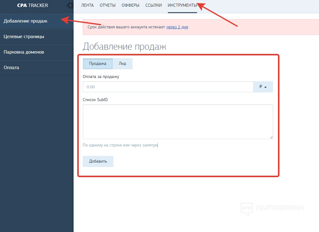 В этом разделе находится несколько дополнительных инструментов для работы со ссылками и доменными именами. Например, в «Добавление продаж» пользователь может добавлять на продажу ссылки, используя SubID. Для этого нужно перейти в соответствующий раздел, установить оплату за продажу и внести SubID. Вносить можно списком или через запятую. Оплата тоже выбирается под разную валюту: рубли, американский доллар, гривна, тенге и евро.