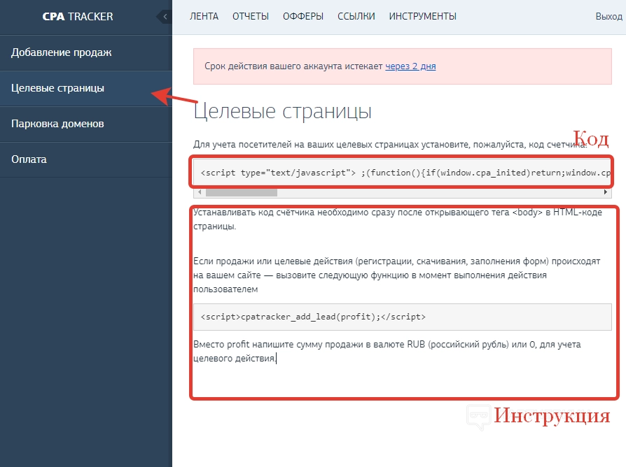 Блок «Целевые страницы» отображает специальный код, при добавлении которого пользователь может учитывать посетителей на целевых страницах собственного сайта. Инструкция по внедрению кода счетчика отображена в интерактивном окне.