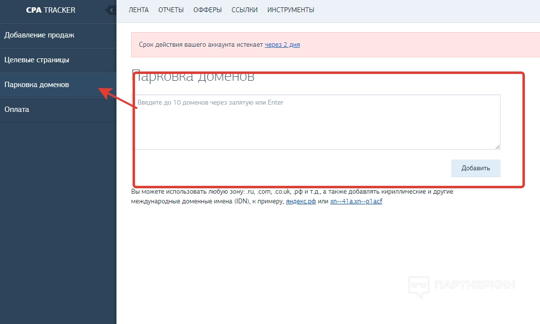 Чтобы припарковать доменное имя, необходимо воспользоваться соответствующим окном и нажать кнопку «Добавить». Одновременно можно внести до 10 доменов списком или через запятую.