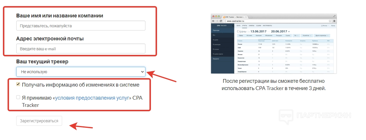 В процессе создания аккаунта нужно указать собственное имя (или название компании), адрес электронной почты и текущий трекер. Сервис совместим со следующими вариантами: