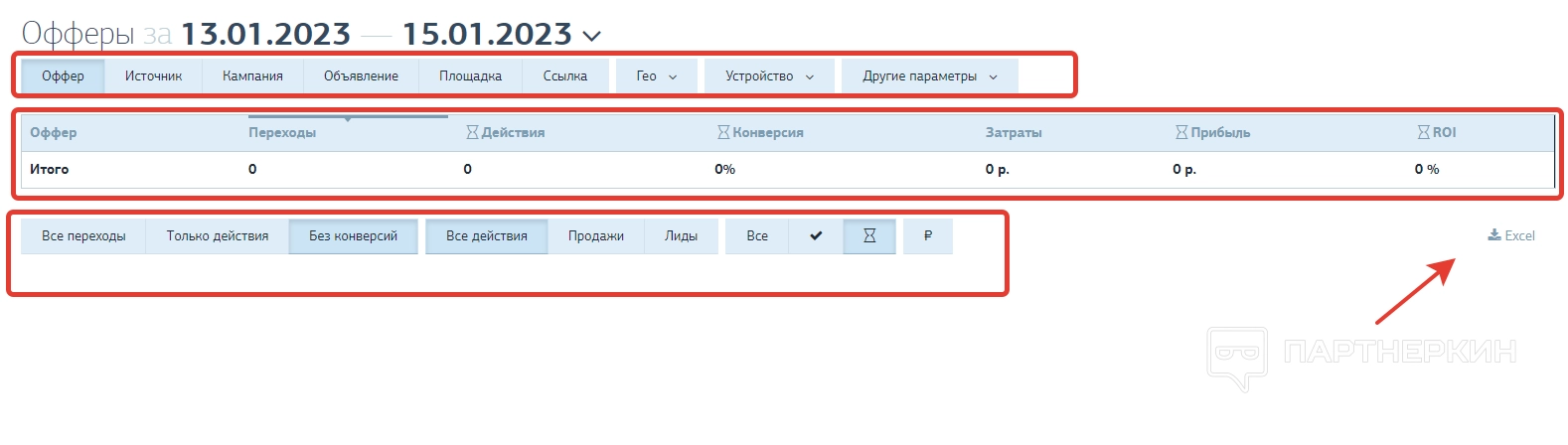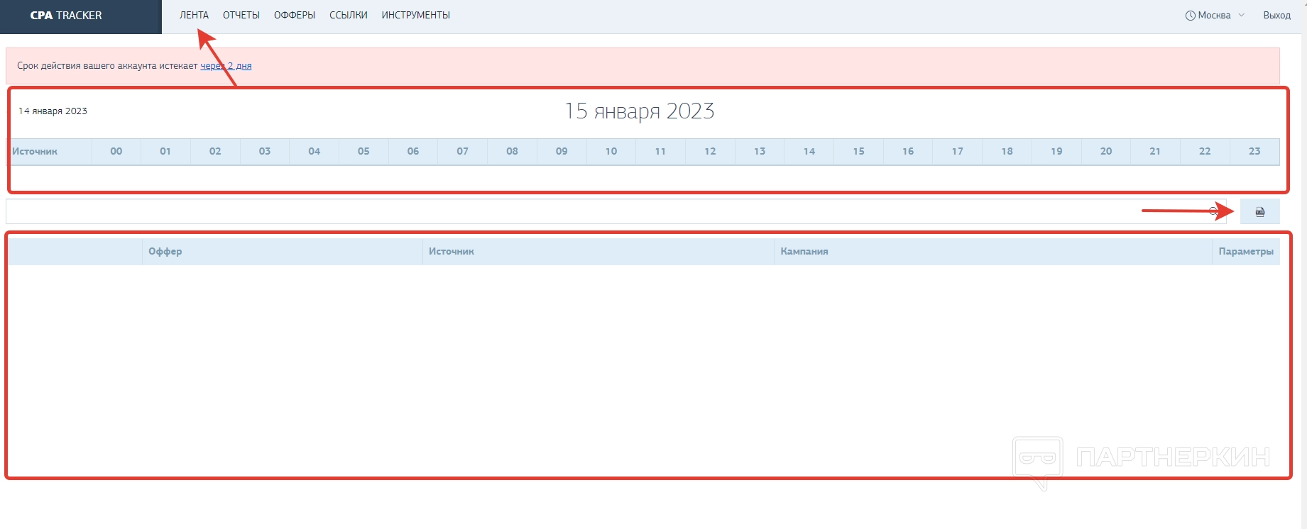Теперь разберем особенности каждого раздела из панели управления. По умолчанию система отображает раздел «Лента», в котором есть календарь и список ссылок, которые сортируются по офферам, источникам, кампании и параметрам. Работать с данными можно не только в веб-режиме, но и на устройстве. Для этого есть специальная кнопка, позволяющая скачивать сведения в xlsx формате.