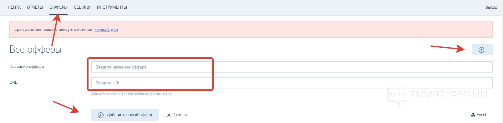 Чтобы добавить новый оффер, кликаем на значок с плюсиком, вводим название, добавляем ссылку на страницу и жмем «Добавить новый оффер».