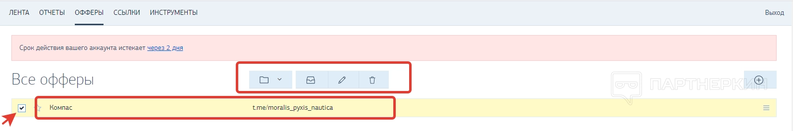 Когда оффер добавится, на странице появится строка, где будет его название и ссылка на целевую страницу. С добавленным оффером можно выполнять различные манипуляции. Например, перемещать в определенную папку, помещать в архив, менять содержимое или удалять. Для этого нужно всего лишь поставить галочку напротив названия и выбрать соответствующее действие.