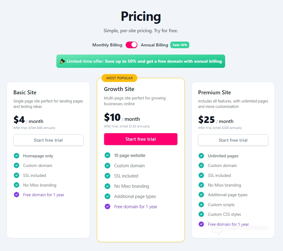 - Growth Site ($10 в месяц). Включает в себя создание многостраничного сайта. что делает его подходящим для для развития бизнеса в интернете. Пользователи этого тарифа могут создавать до 10 страниц, использовать пользовательский домен и дополнительные типы страниц. Как и в базовом тарифе, SSL сертификат включен, на сайте отсутствует бренд Mixo, а также предоставляется бесплатный домен на 1 год.