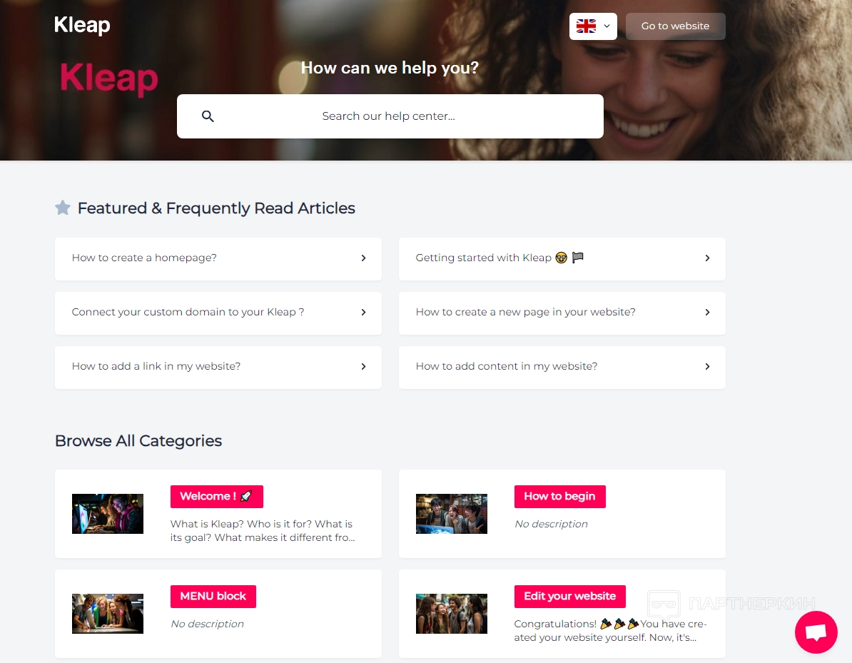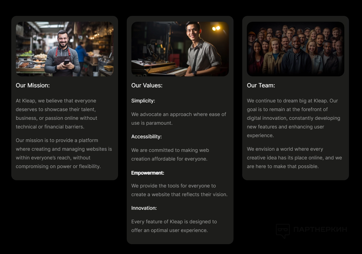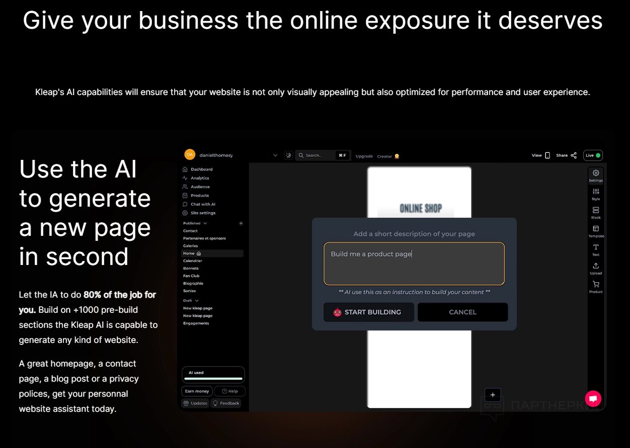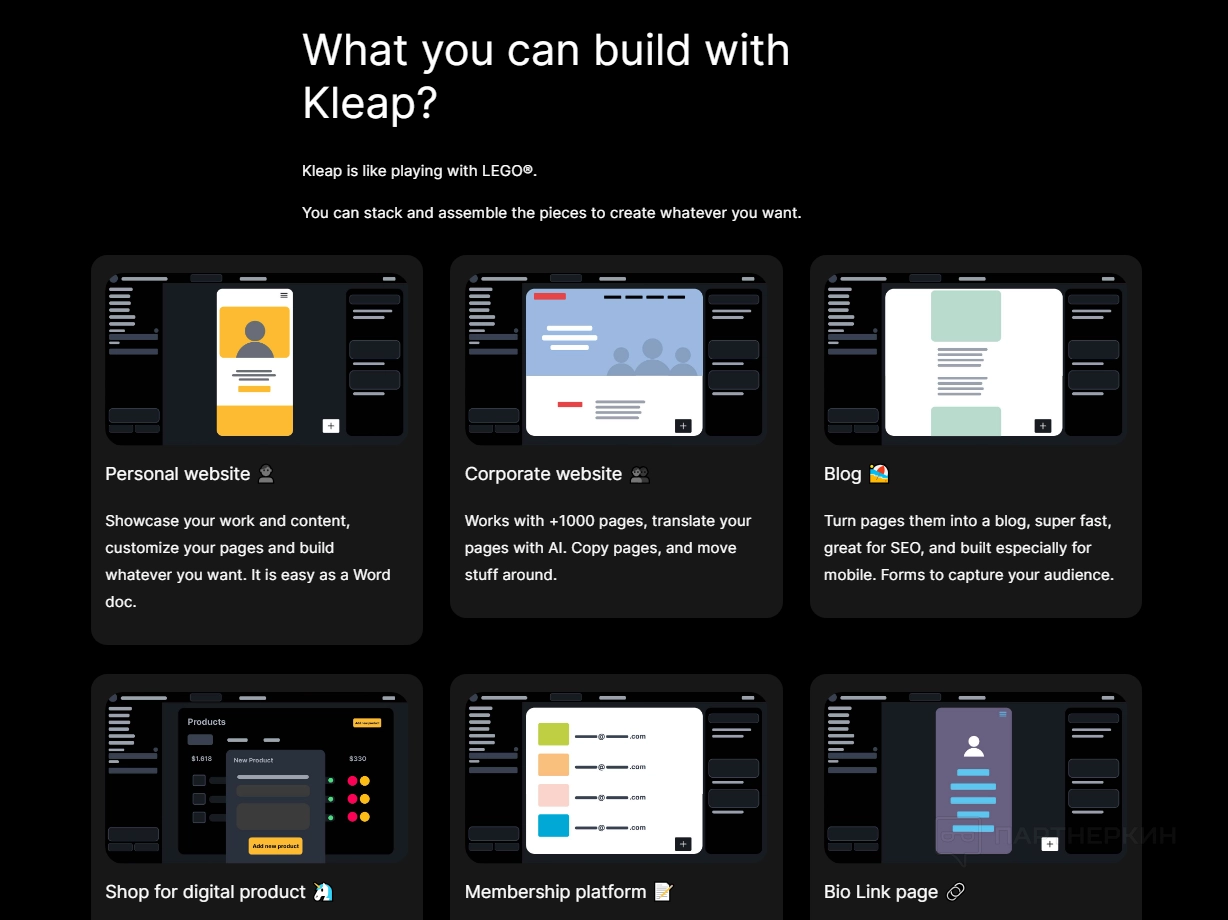 Здесь пользователи могут узнать о различных функциях платформы: инструменты для создания веб-сайтов и настройки SEO. Этот раздел также включает демонстрационные версии продуктов и примеры успешных проектов, созданных с помощью Kleap.
