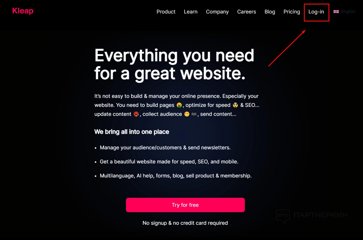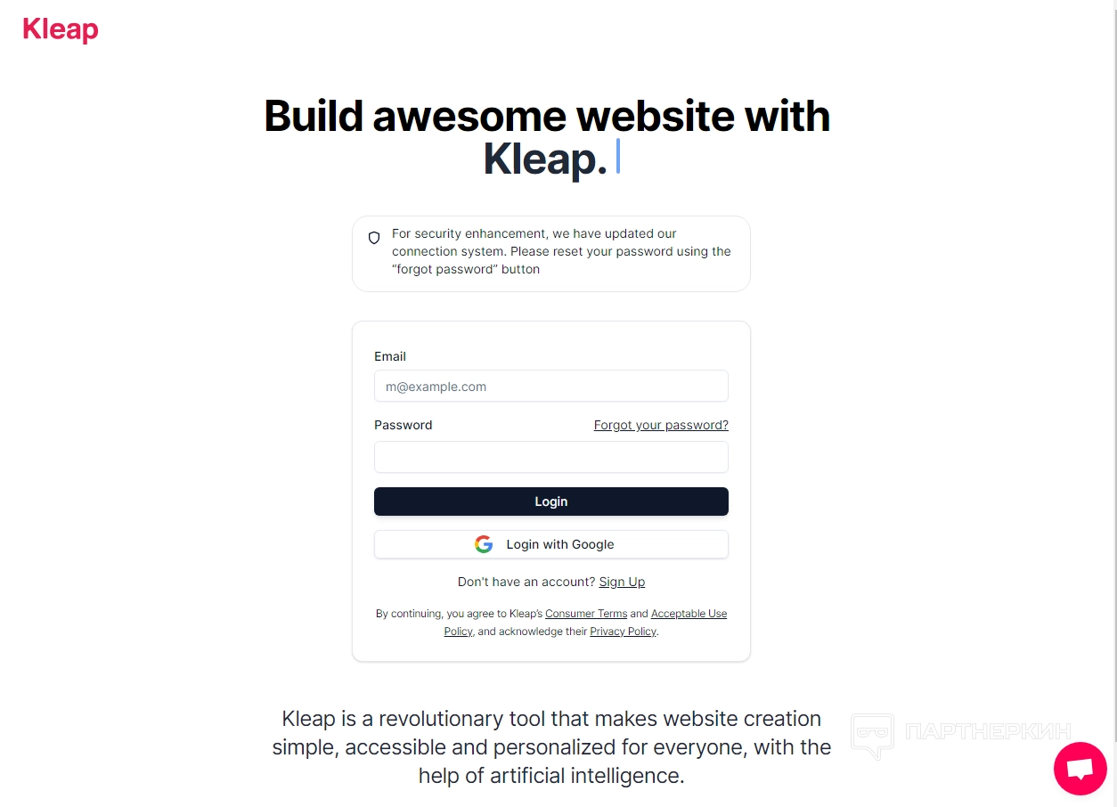 Кнопка Log-in позволяет пользователям войти в свои аккаунты на платформе Kleap.