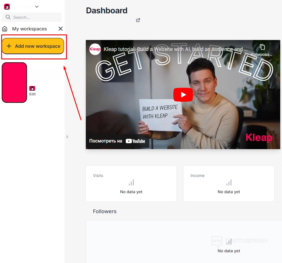 Для начала работы необходимо нажать на иконку профиля, после чего появится кнопка Add New Workspace.