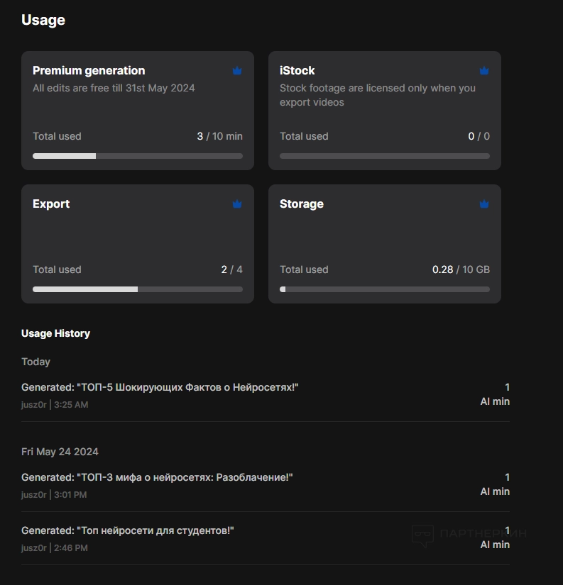 - сколько использовано футажей с iStock (на платных тарифах);