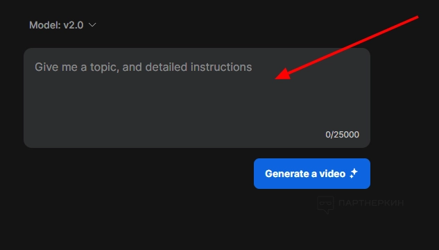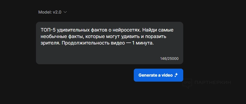 Промт может быть любым. Мы решили «поиграть» с простым вариантом, чтобы оценить результат. На один запрос дается 25 000 символов! Этого достаточно для съемки полнометражного фильма.