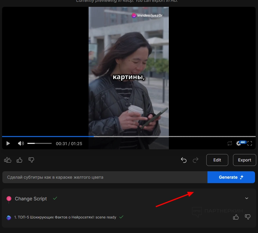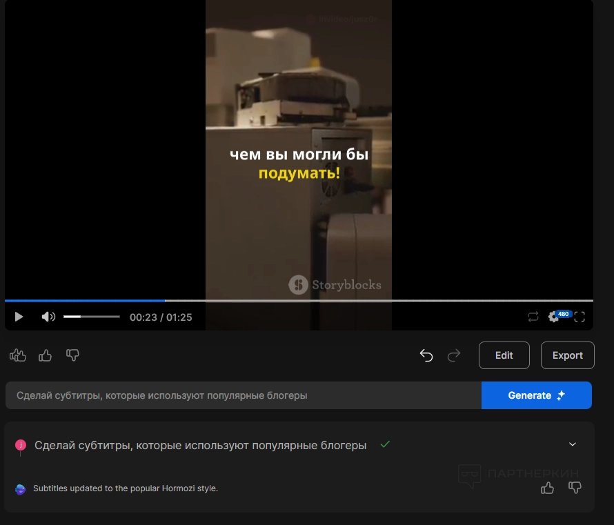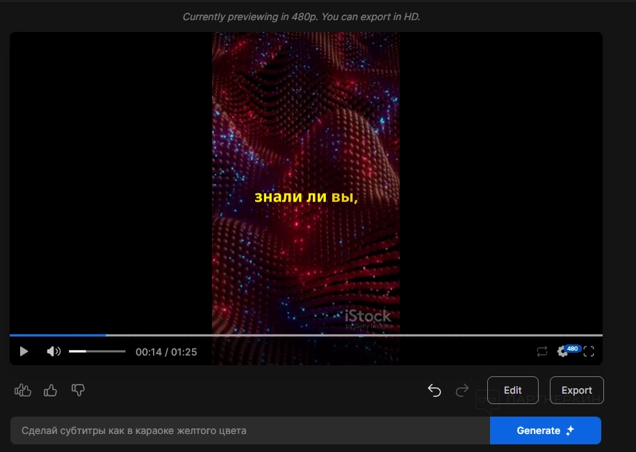 Вы также можете вносить изменения в видео другим способом. На главной странице под роликом есть строка «Give me a command to edit the video». Дадим нейросети следующие запрос: «Сделай субтитры как в караоке желтого цвета». Нажмем «Generate».