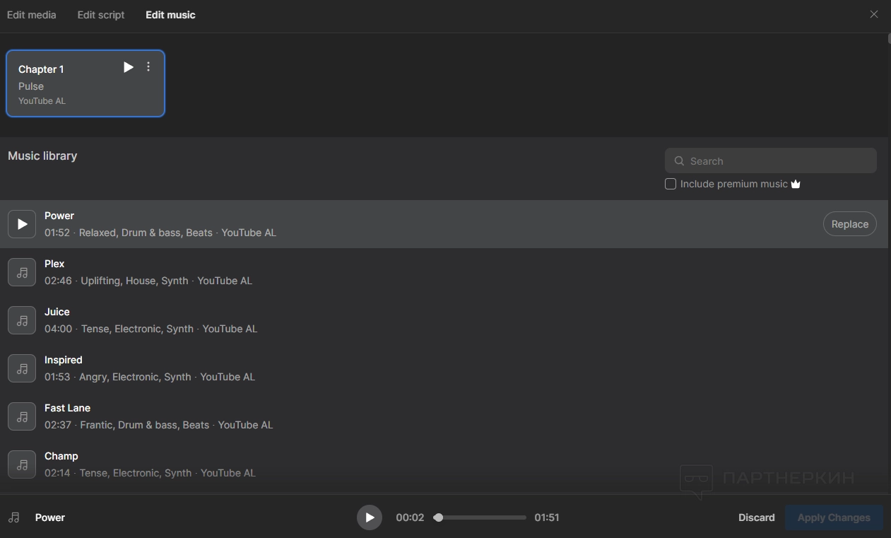Edit music . В этом разделе вы можете заменить музыку. На бесплатном тарифе есть много достойных вариантов: от энергичного и заряженного саундтрека до спокойного и умиротворенного. На платном тарифе музыкальная библиотека еще шире.