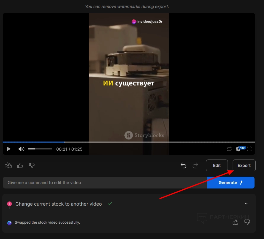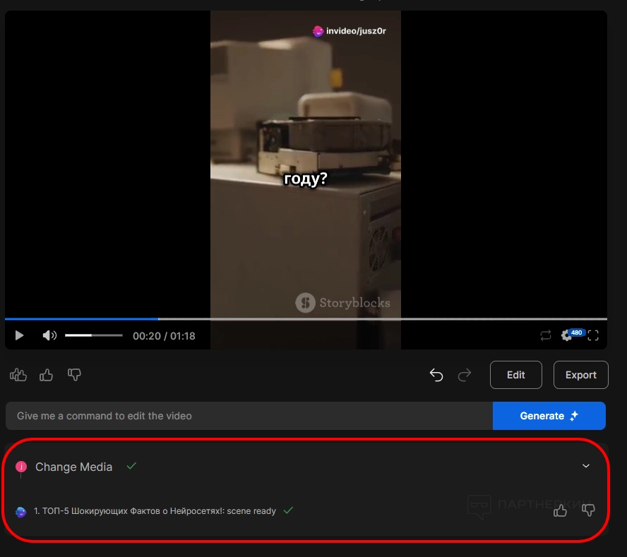Попросим заменить первое стоковое изображение. Скажем нейросети, что референс подобран неверно. Напишем промт на английском языке: «Change current stock to another video».