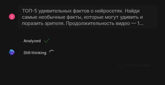Во время генерации на экране отображаются разные процессы (нейросеть анализирует запрос и «продолжает думать»).