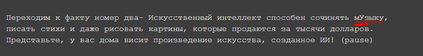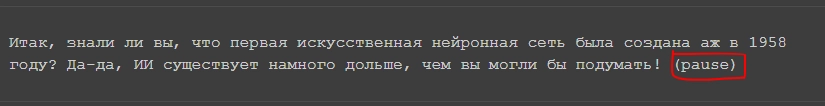 - Паузы. Если спикер будет говорить монотонно, его речь будет сложно воспринимать на слух. Паузы помогают сбавить темп речи и сделать ее более легкой для восприятия. Если вы хотите разделить части текста паузой, просто напишите в нужном месте (pause). В нашем случае нейросеть сама расставила паузы между фактами.