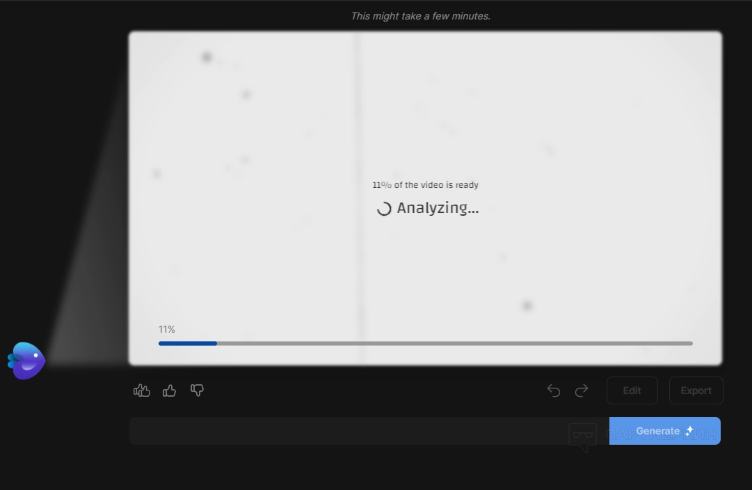 Ролик генерируется. На экране отображаются разные процессы, над которыми работает нейросеть: анализ информации, подбор музыки, поиск голосов, футажей, создание скрипта и многое другое.