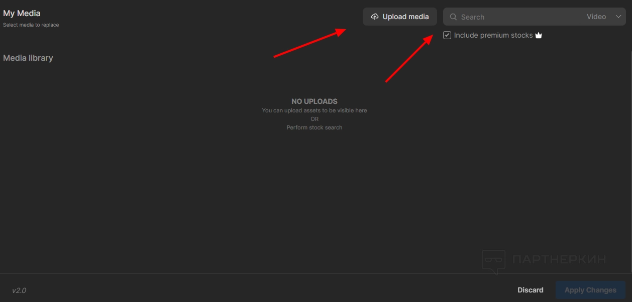 Если какой-то сток вам не нравится, вы можете загрузить другой футаж по кнопке «Upload media». В платной версии есть встроенный сервис с футажами — их можно найти через внутренний поиск.