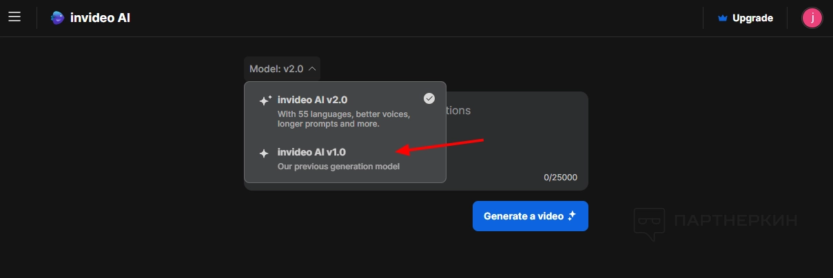 После создания аккаунта вас перенаправит на рабочую страницу, где и будет происходить генерация ролика. По умолчанию здесь стоит версия 2.0 (поддерживает 55 языков, более качественные голоса, длинные промты и другие полезные возможности). Если по каким-то причинам вам необходимо включить предыдущую версию (v1.0), то просто нажмите на нее в выпадающем списке. Мы будем работать на версии 2.0.