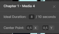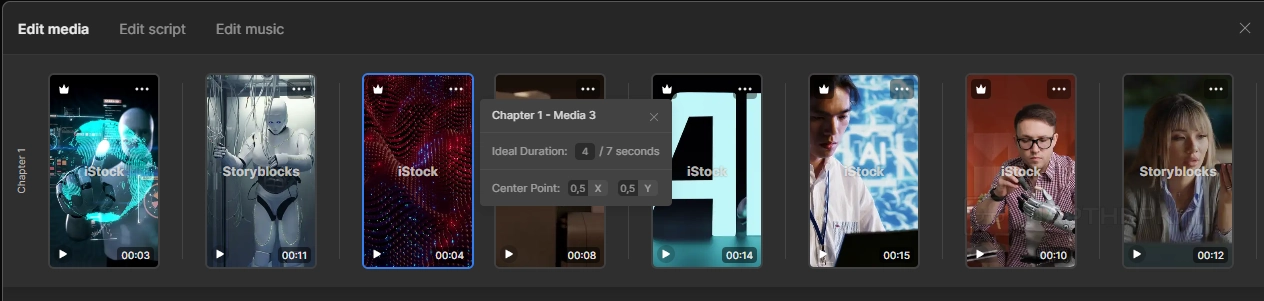 Для изменения продолжительности любого стока нажмите значок «три точки» и укажите нужное время. Обратите внимание, что на примере ниже указана «идеальная продолжительность» (до 10 секунд). Также есть возможность изменить central point (лучше оставлять стандартное значение).