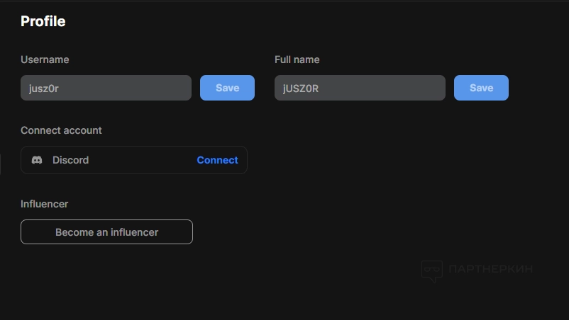 Profile. Здесь можно изменить никнейм, полное имя и присоединиться к странице