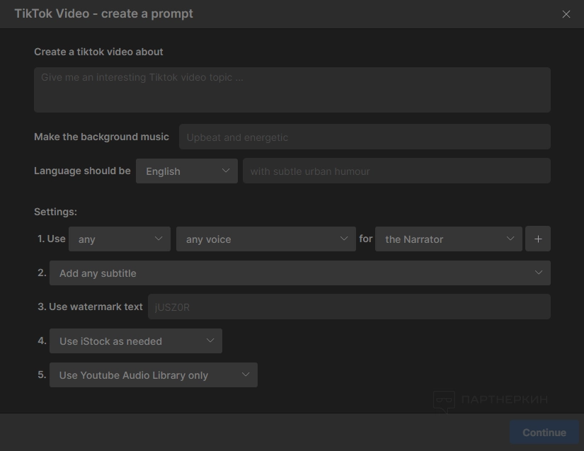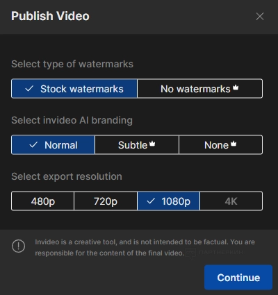 Откроется окно с дополнительными настройками. На бесплатной версии мы можем сохранить ролик с водяными знаками и в качестве 1080p (отметим, что 4K нет даже на тарифе Max. Возможно, появится позже). Внизу есть такое примечание: «Invideo — это творческий инструмент, и он не предназначен для фактологии. Вы несете ответственность за содержание конечного видео». Выбираем нужные настройки и нажимаем «Continue».
