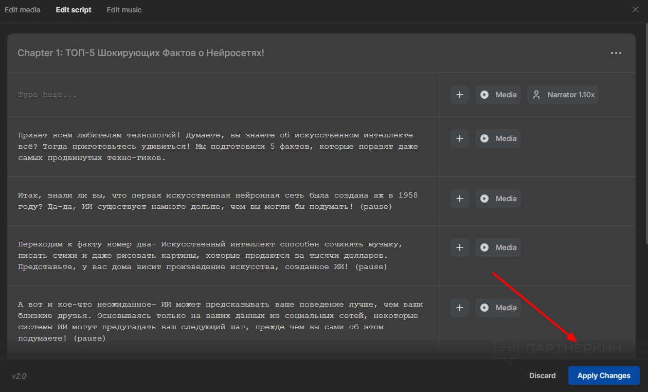 Изменение текста. Помните, что нейросеть придумывает сценарий самостоятельно. Возможно, какие-то факты вам покажутся неинтересными, и вы захотите их заменить. Нужно просто выделить фрагмент текста, удалить его и вставить свой вариант (при этом