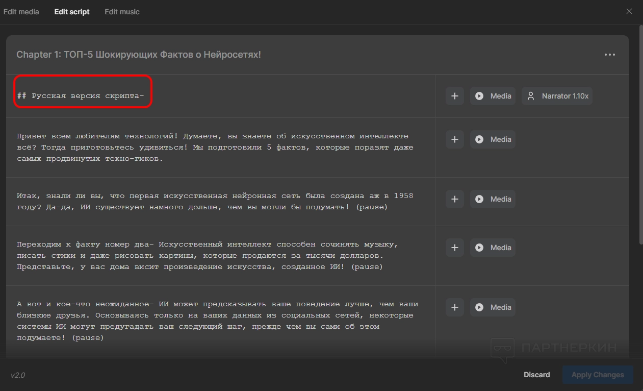 Invideo AIавтоматически переозвучит новый фрагмент текста — это очень удобно). Отметим, что нейронная сеть периодически выдает странные фразы. Например, в самом начале спикер говорит: «русская версия скрипта», а перед этим еще стоят символы ##». Это ошибка, которую легко убрать — выделяем фрагмент и нажимаем Delete на клавиатуре.