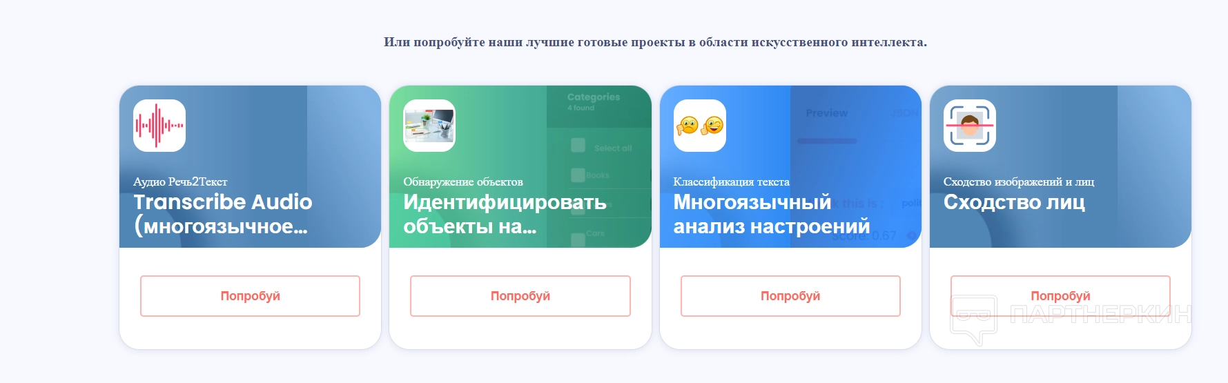 После этого открывается личный кабинет, где доступны инструменты платформы. Здесь пользователи могут создавать собственные модели искусственного интеллекта, настраивать их и обучать в соответствии с нуждами проекта. Также доступны предустановленные модели, которые можно использовать для различных задач без необходимости в глубоких знаниях программирования или ИИ. Этот подход делает