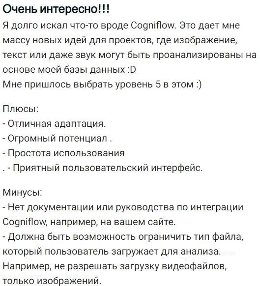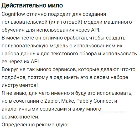 Пользователи ценят возможность создания собственных моделей машинного обучения через API Cogniflow, что обеспечивает гибкость и интеграционные возможности с другими сервисами, такими как Zapier и Pabbly Connect.